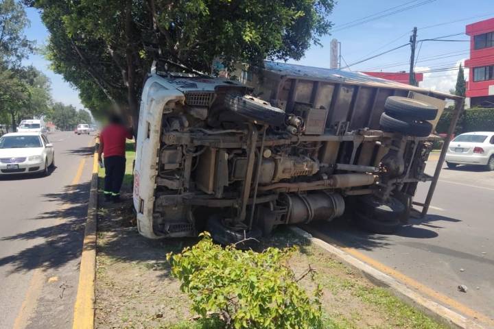 Un camión repartidor de productos lácteos volcó en la avenida Madero Oriente de Morelia y terminó atravesado sobre un camellón. Afortunadamente no hubo lesionados, sólo daños materiales, mencionaron fuentes policiales.
