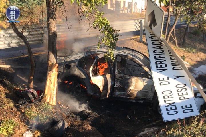 Totalmente destruido, así terminó un auto particular tras volcar y chocar contra un árbol, para terminar incendiándose, sobre la carretera Morelia ? Pátzcuaro, donde sus ocupantes lograron ponerse a salvo.