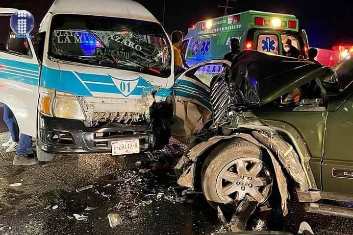 El fuerte choque de frente entre una camioneta y una combi del transporte público dejó como saldo 6 personas lesionadas, así como cuantiosos daños materiales, en esta demarcación de Lázaro Cárdenas.
