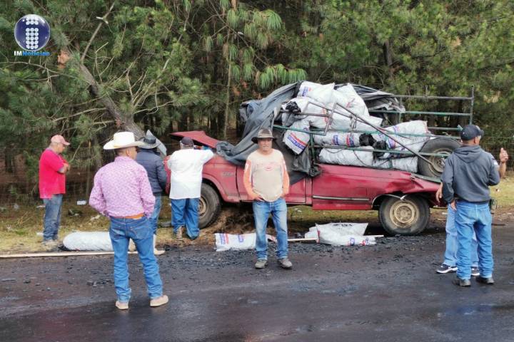 NOTICIAS 08/01/2022Aparatoso accidente cerca de AngahuanUn matrimonio que viajaba en una camioneta, sufrió algunos golpes, luego de que su unidad derrapara sobre piso mojado, se saliera del camino y terminó impactándose contra un pino; un camión tipo Torton que iba en sentido opuesto, terminó parcialmente fuera del camino, al evitar impactarse contra la camioneta.