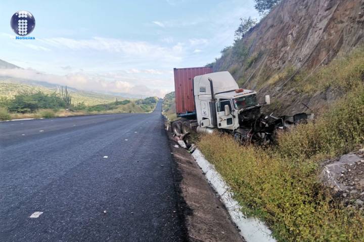 Un tractocamión se salió del camino y se impactó contra un talud de tierra a un costado de la carretera Uruapan-Lázaro Cárdenas situación que lo dejó destrozado.