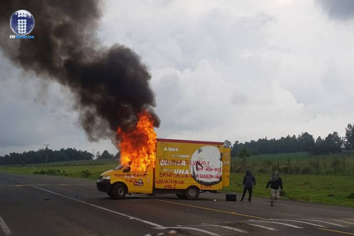 La unidad siniestrada es una camioneta de la empresa Sabritas y la protesta es dirigida a la actual administración estatal.