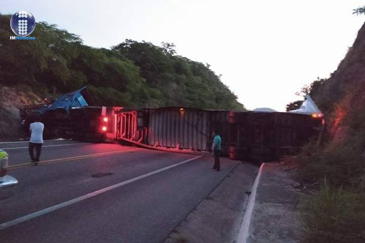 Un tractocamión se volcó en la autopista Siglo 21 motivo por el cual está se encuentra bloqueada y personal de la Guardia Nacional supervisa su remoción.