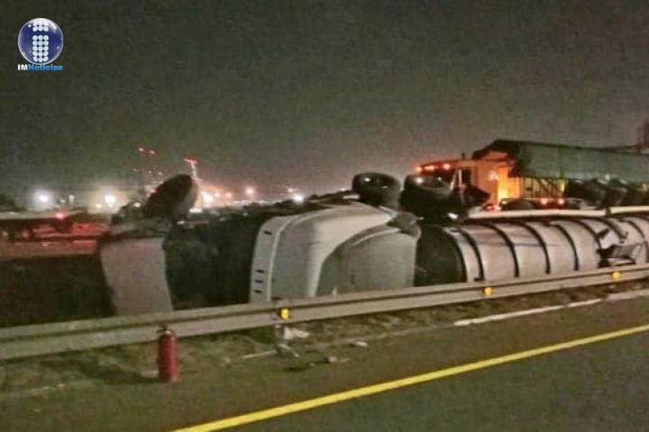 Un tráiler que llevaba una pipa cargada con ácido fosfórico chocó y se volcó sobre el acceso de la autopista Siglo XXl en el municipio de Lázaro Cárdenas.
