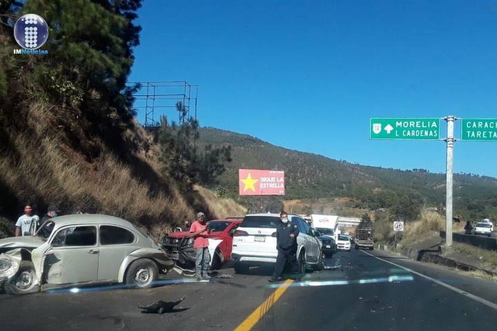 Una carambola automotriz que por fortuna no dejó víctimas que lamentar en la que estuvieron involucrados varios vehículos entre ellos un camión se registró este día en la autopista "Siglo XXI" en este municipio de Uruapan, a donde se trasladó el personal del Batallón de Seguridad en Carreteras e Instalaciones de la Guardia Nacional (GN), así como unos paramédicos locales para atender la emergencia.