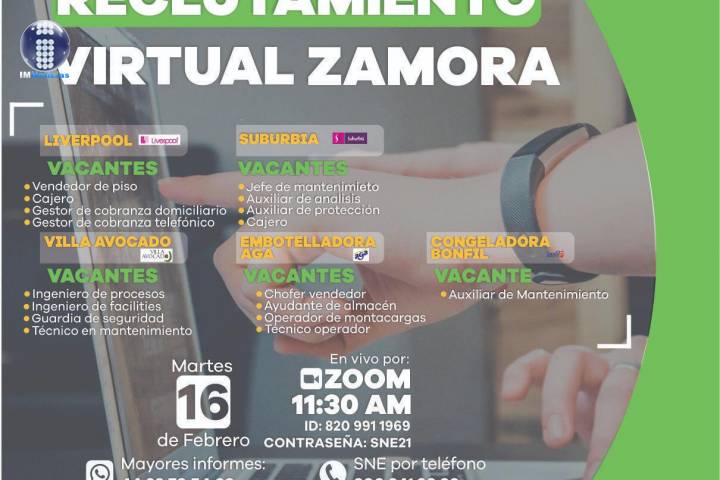 NOTICIAS 14/02/2021Esta semana se realizarán eventos de reclutamiento en Zamora, Ziracuretiro y Morelia La Secretaría de Desarrollo Económico (Sedeco), y el Servicio Nacional de Empleo (SNE), llevarán a cabo eventos de reclutamiento virtual en Zamora, Ziracuaretiro y Morelia, los días martes 16, miércoles 17 y jueves 18 de febrero.