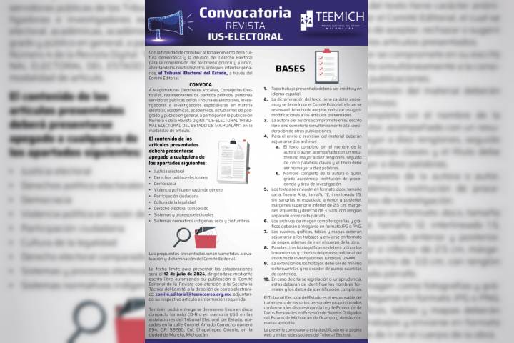 NOTICIAS 02/04/2024TEEMICH publica convocatoria para participar en el número 4 de "IUS - ELECTORAL TRIBUNAL ELECTORAL DEL ESTADO DE MICHOACÁN"Con la finalidad de contribuir al fortalecimiento de la cultura democrática y la difusión del Derecho Electoral para la comprensión del fenómeno político y jurídico, abordándolos desde distintos enfoques interdisciplinarios, el Tribunal Electoral del Estado, a través del Comité Editorial a participar en la publicación Número 4 de la Revista Digital: "IUS-ELECTORAL TRIBUNAL ELECTORAL DEL ESTADO DE MICHOACÁN", en la modalidad de artícu... Ver más...