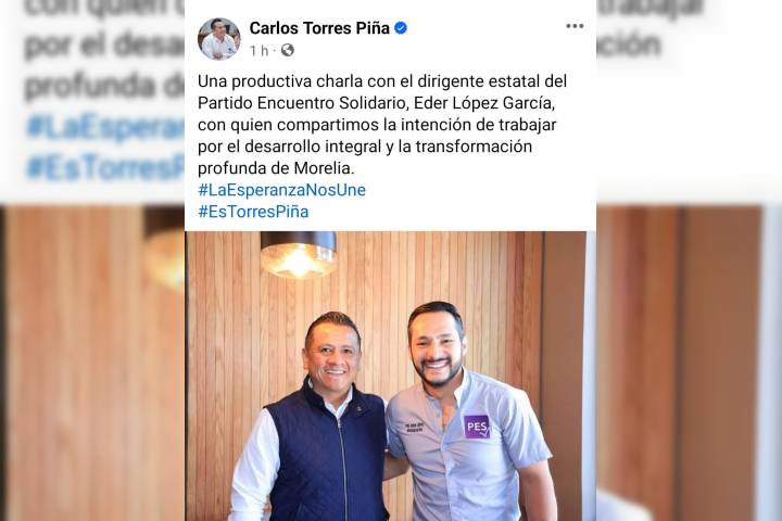 Este martes el dirigente estatal del Partido Encuentro Solidario (PES), Eder López García, se reunió con el coordinador de la 4T en Morelia, Carlos Torres Piña, bajo evidentes intenciones de tejer acuerdos rumbo a la contienda por la capital michoacana, con lo que la posibilidad de que Alfonso Martínez Alcázar establezca acuerdos electorales con dicho partido cada vez se ve más lejana. El acercamiento entre Carlos Torres Piña y el di...