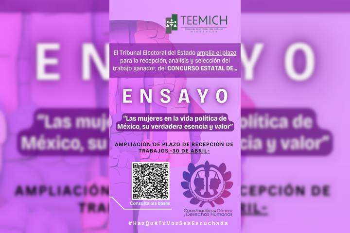 El Tribunal Electoral del Estado te invita a participar en el concurso estatal de ensayo "Las mujeres en la vida política de México, su verdadera esencia y valor". Yolanda Camacho Ochoa, Magistrada del Tribunal Electoral del Estado detalló los ensayos participantes podrán ser entregados hasta el 30 de abril de 2024 y sus temas deberán manifestar referirse a la importancia de las Mujeres en nuestra Democracia, reflejándolo en ensayos rel...