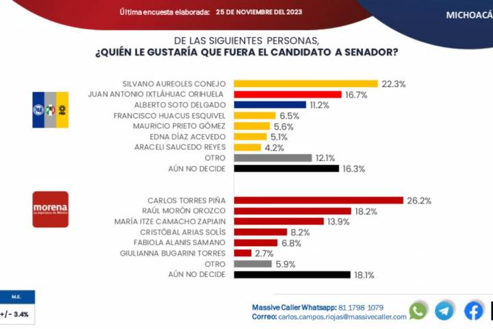 Respecto a Torres Piña, explicó la encuestadora que Carlos Torres Piña tiene un 26.2 por ciento, mientras que el segundo lugar tiene apenas 18 por ciento de las preferencias y en tercer lugar Cr... Ver más...