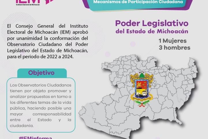 NOTICIAS 05/09/2022Aprueba el IEM Observatorio Ciudadano del Poder LegislativoCon el objeto de garantizar el derecho de la ciudadanía para involucrarse en las labores que desarrollan las instituciones gubernamentales en la Entidad, en sesión ordinaria, el Consejo General del Instituto Electoral de Michoacán (IEM) aprobó por unanimidad la conformación del Observatorio Ciudadano del Poder Legislativo del Estado de Michoacán.