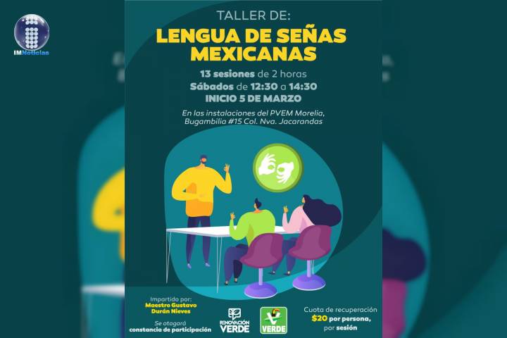 NOTICIAS 02/03/2022Invita Partido Verde al taller de Lengua de Señas MexicanasComo parte del compromiso y la visión de promover acciones incluyentes entre la sociedad moreliana, el Comité Municipal del Partido Verde Ecologista de México (PVEM) invita a la población a participar en el taller de Lengua de Señas Mexicanas a iniciar el próximo sábado 5 de marzo.