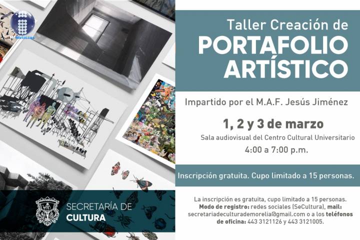 NOTICIAS 18/02/2022SeCultura te invita a inscribirte al Taller "Creación de Portafolio Artístico"Con la intención de crear, ordenar, planear, gestionar y, realizar actividades y acciones de auto gestión de proyectos creativos, la Secretaría de Cultura de Morelia (SeCultura), invita a artistas y alumnos de carreras afines a las Bellas Artes, al Taller "Creación de Portafolio Artístico" que se efectuará los próximos 1, 2 y 3 de marzo.