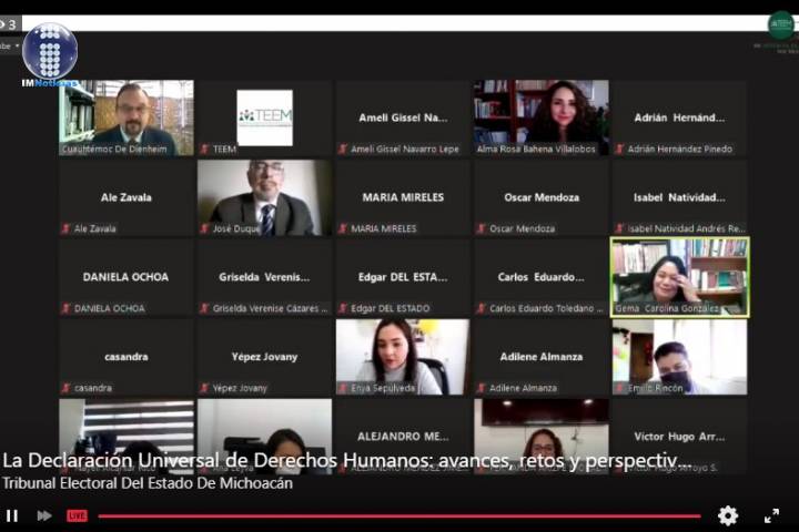 NOTICIAS 10/12/2021Presenta especialista, avances y retos de declaración universal de derechos humanosEl Maestro Cuauhtémoc Manuel de Dienheim Barriguete ofreció este viernes la Conferencia "La Declaración Universal de Derechos Humanos: avances, retos y perspectivas" que impulsó el Tribunal Electoral del Estado de Michoacán en el marco del Día Internacional de los Derechos Humanos.