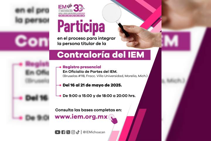 NOTICIAS 16/05/2025Inicia recepción de documentos para ocupar la titularidad del órgano de control interno del IEMEl Instituto Electoral de Michoacán (IEM) informa que a partir de hoy y hasta el próximo 21 de mayo se llevará a cabo la recepción de documentos para quienes deseen participar en el concurso público abierto para ocupar la titularidad del Órgano Interno de Control del Instituto.