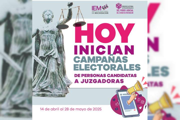 NOTICIAS 15/04/2025Inician campañas electorales de las personas juzgadoras del Poder Judicial de MichoacánEste lunes dieron inicio las campañas electorales de las personas candidatas a juzgadoras que participarán en el Proceso Electoral Extraordinario del Poder Judicial del Estado de Michoacán 2024-2025.