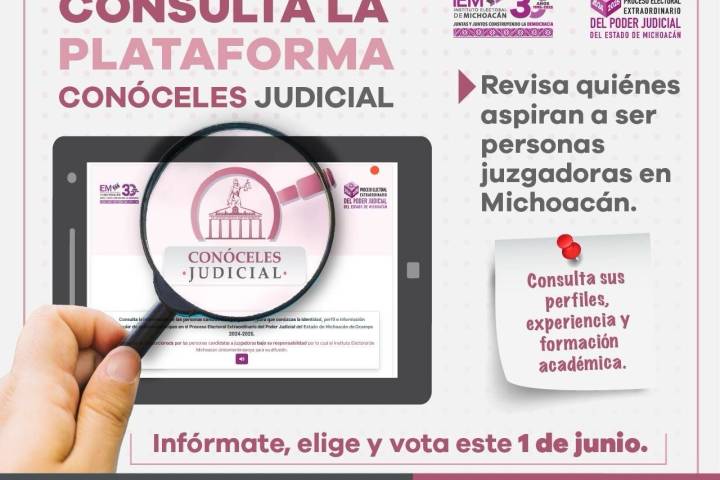 NOTICIAS 20/04/2025Consulta el perfil de quienes aspiran a impartir justicia en MichoacánCon el objetivo de garantizar el derecho de la ciudadanía a emitir un voto informado, el Instituto Electoral de Michoacán (IEM) habilitó el sistema "Conóceles Judicial", una plataforma digital donde se puede consultar la trayectoria profesional y académica de las personas candidatas a integrar el Poder Judicial del Estado.