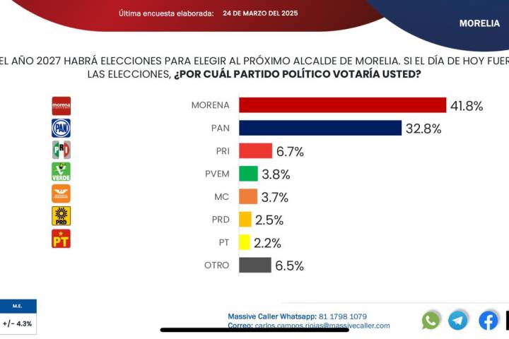 NOTICIAS 25/03/2025Massive Caller: Morena podrÃa gobernar Morelia si selecciona el perfil correcto De acuerdo al más reciente estudio demoscópico realizado por la empresa Massive Caller en la capital de Michoacán el partido movimiento de regeneración nacional (MORENA) podrÃa gobernar nuevamente la ciudad de la cantera rosa cuyos ciudadanos lo señalan como el instituto polÃtico de sus preferencias.