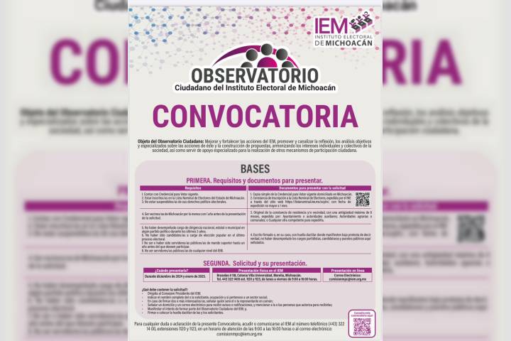 NOTICIAS 17/12/2024El IEM lanza la convocatoria para la conformación de su Observatorio CiudadanoEn Sesión extraordinaria Urente el Consejo General del Instituto Electoral de Michoacán (IEM), aprobró la convocatoria para la conformación de su Observatorio Ciudadano, un órgano de monitoreo social que busca promover la participación ciudadana en la vida pública del estado.