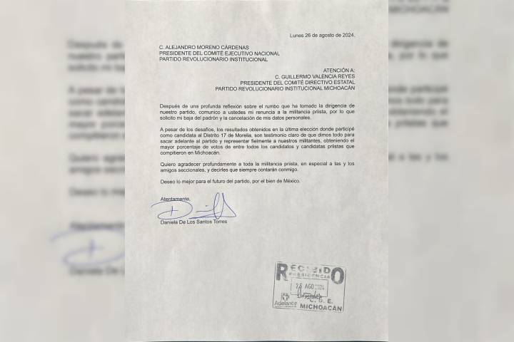 Tras 16 años de militancia, la diputada local, Daniela de los Santos Torres, se va del Partido Revolucionario Institucional (PRI) en Michoacán. "Después de una profunda reflexión sobre el rumbo que ha tomado la dirigencia de nuestro partido, comunico a ustedes mi renuncia a la militancia priista", se lee en el escrito dirigido al presidente del comité estatal, Guillermo Valencia Reyes. En este documento se le dio vista también al di...