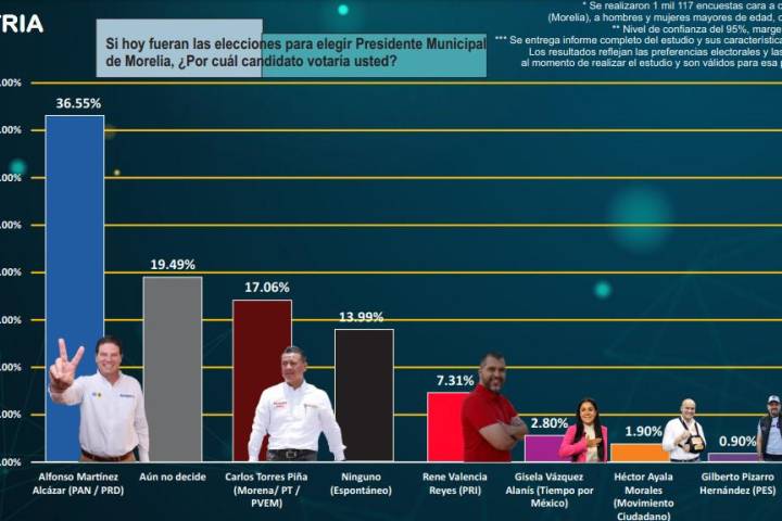 En el más reciente estudio de Policymetria, Alfonso MartÃnez cuenta con un 36.55% de votos a su favor, seguido del candidato de Bedolla y morena que registra 17.06% y muy rezagado, el abanderado del PRI... Ver más...