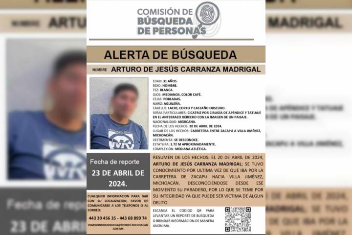 Se trata de Arturo de Jesús C., de 31 años de edad, mismo que fue visto por última vez el pasado sábado 20 de abril, cuando circulaba sobre la carretera Zacapu – Villa Jiménez, las horas transcurrieron sin que sus familiares lograran e... Ver más...