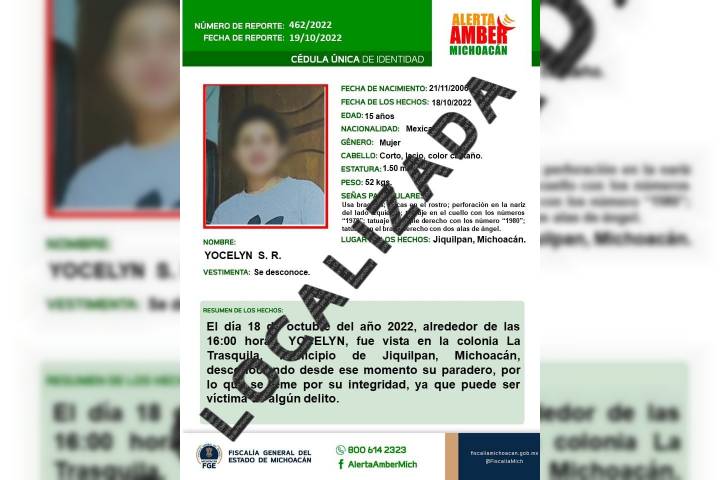 Trascendió que la adolescente era buscada mediante "Alerta Amber", desde el pasado 18 de octubre, quien desapareció cuando se encontraba en las inmediaciones de la comunidad de La Trasquila, muni... Ver más...