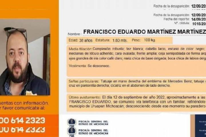 El pasado 12 de septiembre de 2022, Francisco Eduardo se comunicó con un familiar manifestando que se dirigÃa al municipio de Uruapan, desconociendo desde ese momento su paradero, por lo que se presentó la denuncia corr... Ver más...