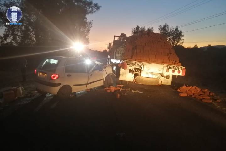 Los hechos se registraron en las inmediaciones del kilómetro 12 de la carretera Coeneo-Comanja, donde un auto Matiz de color blanco se impactó con la parte trasera de un camión Dina de color naranja, cargado con tabiques.