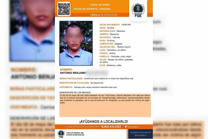 El occiso respondía al nombre de Antonio Benjamín S., P., de 33 años de edad, mismo que era maestro y vecino del Barrio Jerusalén del municipio de Santiago Tangamandapio, persona que de acuerdo con su ficha de b... Ver más...