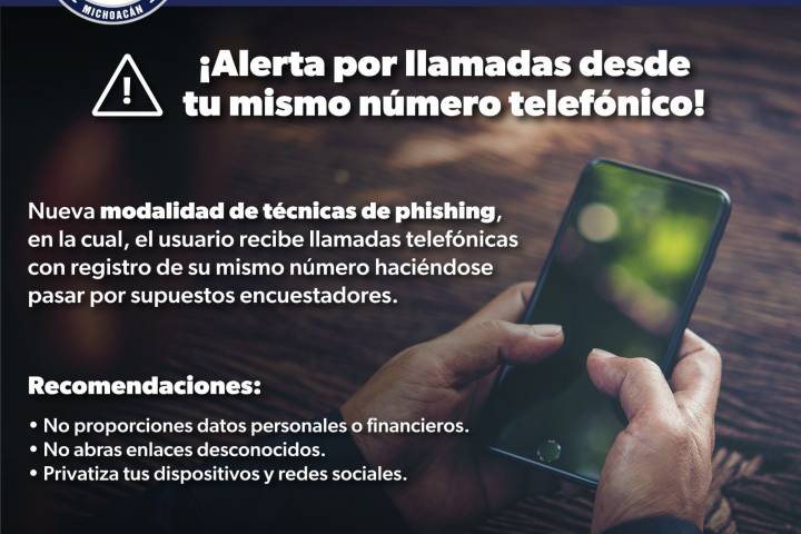 NOTICIAS 27/04/2024¡Cuidado! Si recibes una llamada de tu propio número, no contestes La Secretaría de Seguridad Pública (SSP), a través de la Subdirección de Policía Cibernética, alerta a usuarios de telefonía móvil sobre una nueva modalidad de suplantación de identidad o phishing, donde pueden recibir llamadas registradas como su mismo número, haciéndose pasar por supuestos encuestadores y solicitando información personal.
