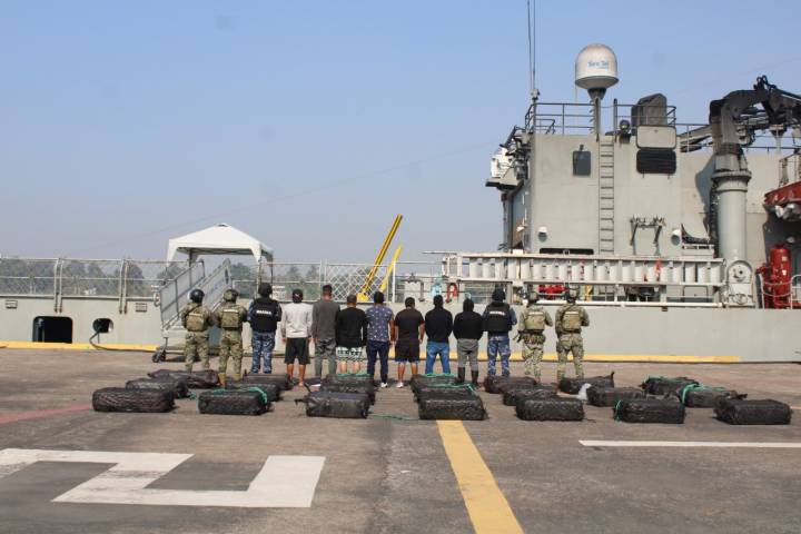 Según informó la Semar, el aseguramiento de dos embarcaciones menores con motores fuera de borda, se dio aproximadamente a 120 millas náuticas (222 kilómetros) al Suroeste del puerto de Lázaro Cárdenas.