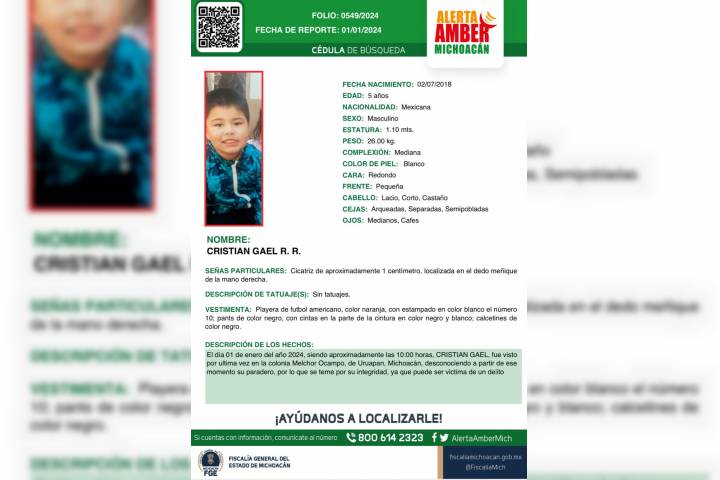 NOTICIAS 02/01/2024Reactivan operativo en busca de niño desaparecido en Uruapan Se ha reforzado el operativo de búsqueda del pequeño Christian Gael, en el que participan, familiares, voluntario y personal de la Secretaría de Seguridad Pública Tránsito y Vialidad Municipal, Guardia Civil y rescatistas de Uruapan, con la finalidad de localizar con bien al niño.
