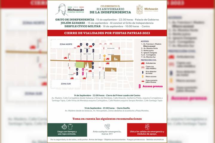NOTICIAS 14/09/2023Estos son los siete puntos de acceso al Centro, por fiestas patriasCon motivo de las fiestas patrias, a partir de las 22:00 horas de este jueves 14 de septiembre, se habilitarán siete accesos para ingresar al Primer cuadro del Centro Histórico de Morelia, a efecto de preservar la seguridad de la población que asiste a los festejos.