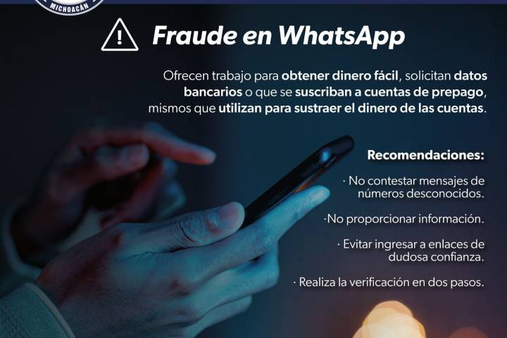 A través de la red social de ?WhatsApp', el personal de la Policía Cibernética encontró que presuntos estafadores se comunican con los usuarios, ofreciéndoles un empleo donde obtendr... Ver más...