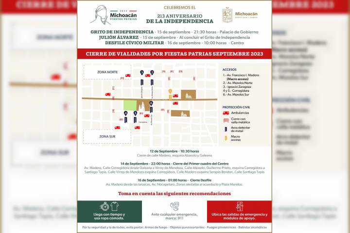 NOTICIAS 12/09/2023Por fiestas patrias, este martes inician cortes viales en Centro Histórico de Morelia El Gobierno de Michoacán dio a conocer el cierre vial que se llevará a cabo por las fiestas patrias 2023, el cual contempla varios cortes a la circulación en el Centro Histórico de Morelia, a partir del 12 y hasta el 16 de septiembre.