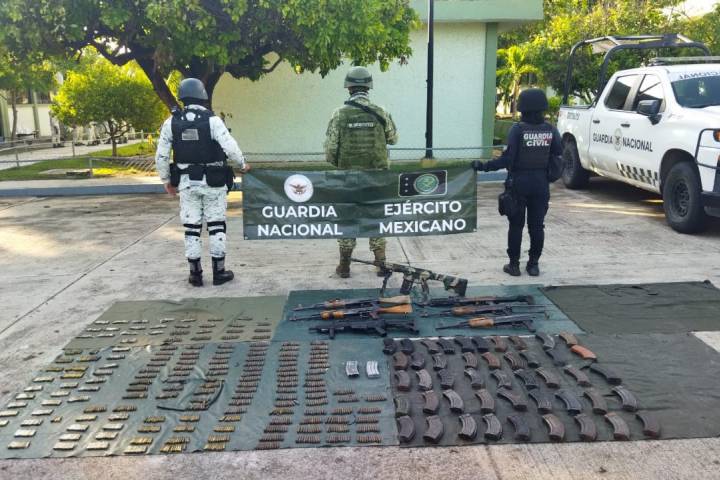 NOTICIAS 11/08/2023SSP, Sedena y GN aseguran armamento y municiones, en Buenavista de recibir un ataque armado y de implementar movilizaciones para dar con los atacantes, los elementos de las Secretarías de Seguridad Pública (SSP), y de la Defensa Nacional (Sedena), junto con la Guardia Nacional (GN); localizaron siete armas largas y más de mil 600 cartuchos útiles, en Buenavista.