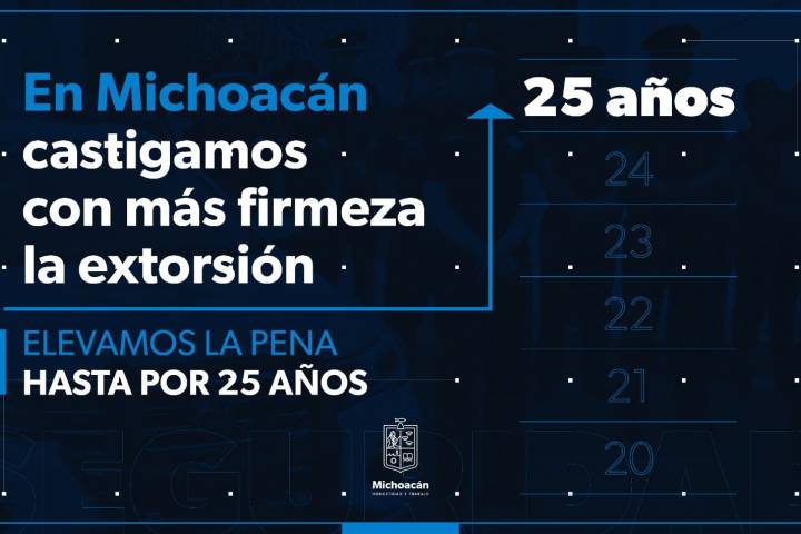 En Michoacán el delito de extorsión se castiga con penas más severas, luego de la entrada en vigor el pasado 2 de marzo de la reforma al Código Penal para el Estado de Michoacán, que establece hasta 25 años de prisión y multas equivalentes a 500 días. Con esta modificación a la ley, ya no se requiere denuncia, es decir que una vez que la autoridad tome conocimiento de la posible comisión de este delito, podrá intervenir de manera i...