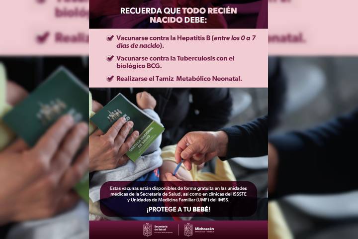 En México y Michoacán, todos los niños recién nacidos deben vacunarse contra la hepatitis B en el primer mes de vida y contra la tuberculosis en los primeros siete días de nacido. Para proteger a las y los niños, la Secretaría de Salud de Michoacán (SSM) pone a disposición estos biológicos así como en los institutos Mexicano del Seguro Social (IMSS) y de Seguridad y Servicios Sociales de los Trabajadores del Estado (ISSSTE). L...