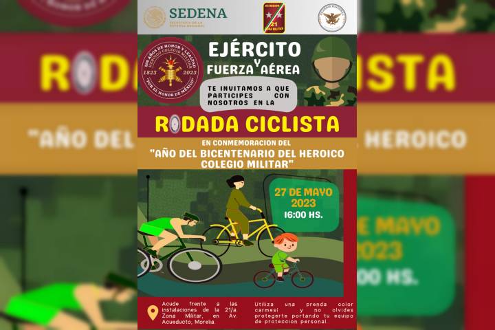 El Ejército y Fuerza Aérea Mexicanos, a través de la Comandancia de la 21/a. Zona Militar, hace una atenta invitación al público en general para que participen este sábado 27 de mayo en la Rodada Ciclista en conmemoración al Bicentenario del Heroico Colegio Militar.