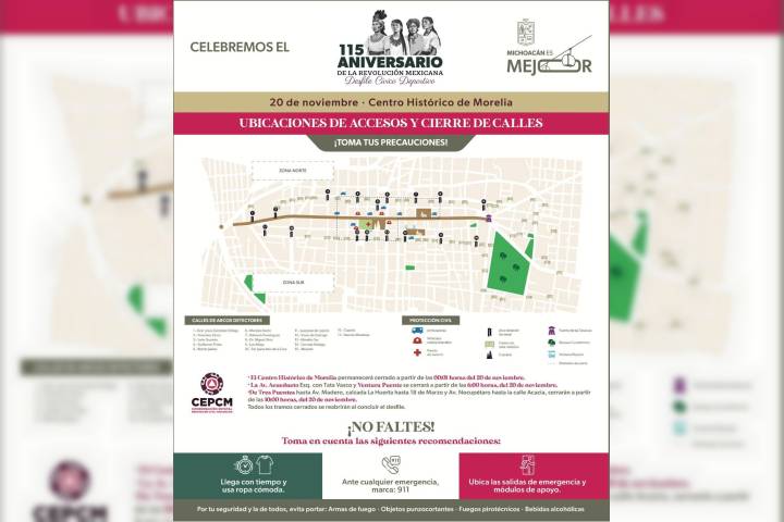 NOTICIAS 19/11/2025Conoce los cierres viales por el desfile del 20 de noviembre en Morelia: SSPLa Secretaría de Seguridad Pública (SSP) informa que a partir de las 00:01 horas del jueves 20 de noviembre iniciarán los cierres vehiculares en calles y avenidas del Centro Histórico de Morelia, con motivo del desfile del 115 Aniversario de la Revolución Mexicana.