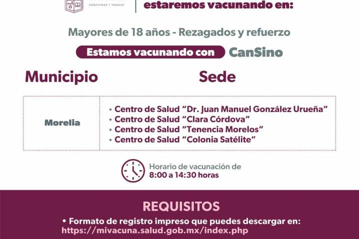 Para ello, la Secretaría de Salud de Michoacán (SSM) ya distribuyó la vacuna CanSino a todos sus centros de salud, a donde podrán acudir a inmunizarse todos los mayores de 18 años que no cuenten con ninguna dosis aplicada contra ... Ver más...