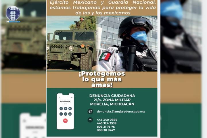 NOTICIAS 08/03/2021Ejército y Guardia Nacional invitan a la denuncia ciudadana en MichoacánCon el objetivo de combatir de manera más eficiente la delincuencia en el estado de Michoacán, la 21 Zona Militar realizó una invitación pública a la ciudadanía para realizar denuncias en caso de detectar algún ilícito, para lo cual puso a disposición del público cuatro líneas telefónicas y un correo electrónico institucional.