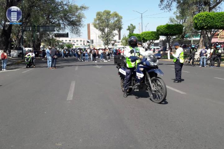 Elementos de la Dirección de Tránsito y Movilidad efectúan cortes a la circulación en las avenidas Francisco I. Madero y Acueducto, toda vez que en dicho sitio se encuentra un grupo de personas que llevan a cabo una manifestación.