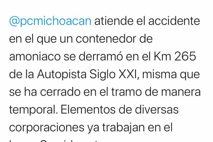 NOTICIAS 06/12/2019Cierre de tramo de autopista Siglo XXI, por derrame de amoniacoPara garantizar la seguridad y la salud de la población, el Gobierno de Michoacán a través de sus distintas instituciones, realiza labores de vigilancia y rescate en la autopista Siglo XXI, a la altura del km. 265, donde se registró la volcadura de una pipa con amoniaco.