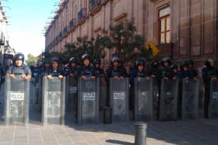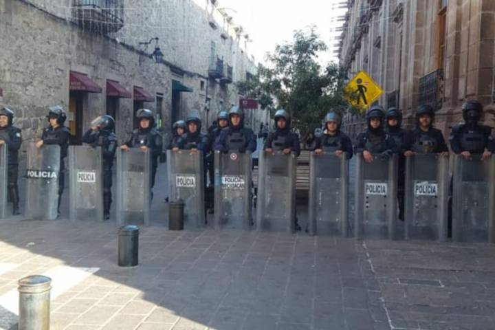 Agentes de la Unidad de Restablecimiento del Orden Público (UROP), mantienen presencia en las inmediaciones de Palacio de Gobierno ante una posible manifestación en el primer cuadro de la capital michoacana.