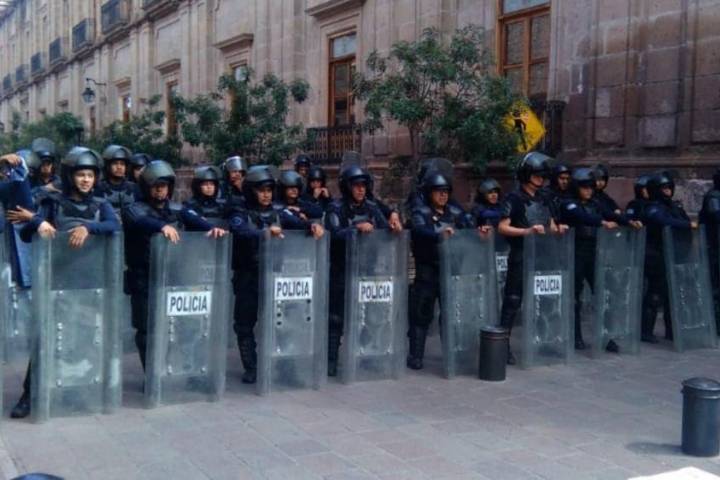 Agentes de la Unidad de Restablecimiento del Orden Público (UROP), mantienen presencia en el primer cuadro de la ciudad, con la encomienda de preservar la tranquilidad de los habitantes michoacanos.