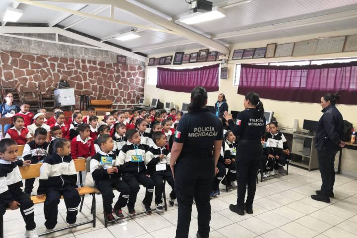 Ejemplo de ello, agentes de la Policía Michoacán llevaron la "Jornada Informativa de Prevención del Delito para Niñas, Niños y Adolescentes" a alumnos de la escuela primaria José Ma. Morelos, beneficiando a 63 menores.