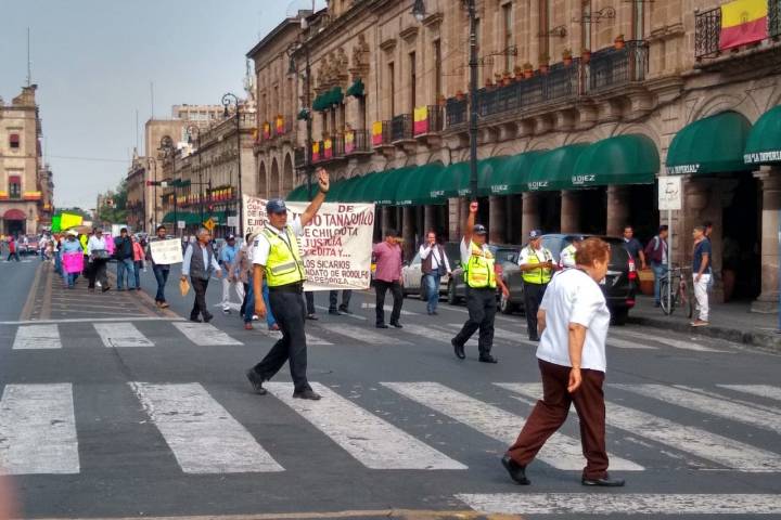 Ante la presencia de manifestantes, elementos de la Policía Michoacán vigilan la zona Centro, a la altura del Congreso del Estado de Michoacán.