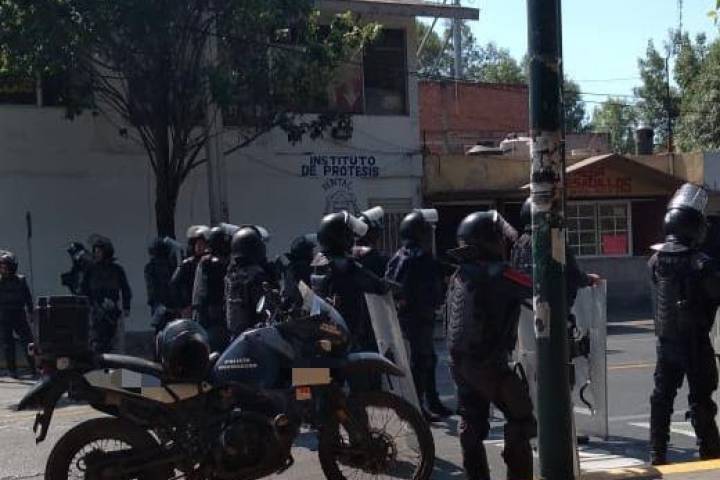 Personal de la Unidad de Restablecimiento del Orden Público (UROP), se encuentra vigilando la manifestación que docentes llevan a cabo en el lugar.